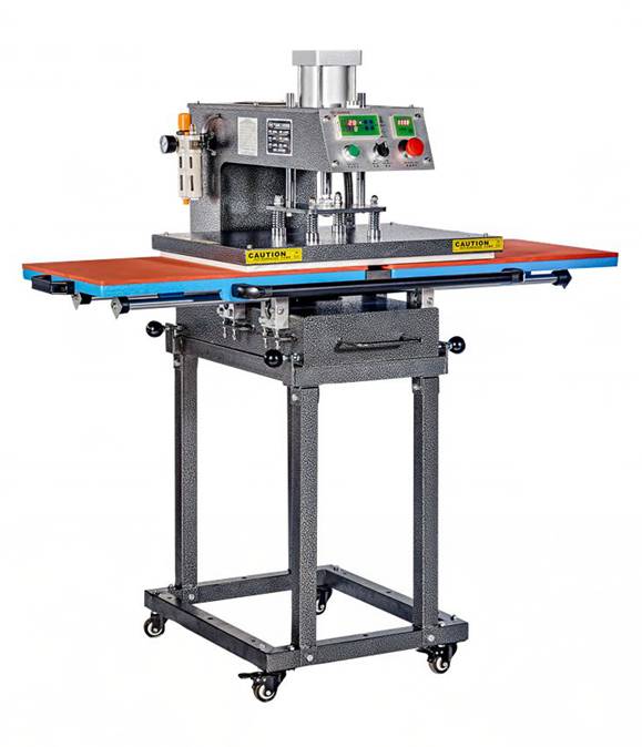 气动双工位烫画机 本机特点: 采用推拉式工作台面,操作省力,承印速度快。 加热板采用特殊管环绕设计,加热均匀,工作台面特殊处理,可承印升华热转印制品。